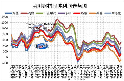圖2是蘭格鋼鐵云商平臺監(jiān)測的各主要鋼材品種的盈利能力曲線對比。從圖2可以看出, 6月份7大品種測算毛利呈先降后升態(tài)勢,各品種平均毛利較上月下降191-305元/噸;其中螺紋鋼毛利下降最多,為305元/噸;鋼坯毛利下降最少,為191元/噸;其他品種盈利下降幅度在213-274元/噸之間。成本明顯上升、鋼價小幅下行,使得6月份鋼企盈利空間顯著收縮。