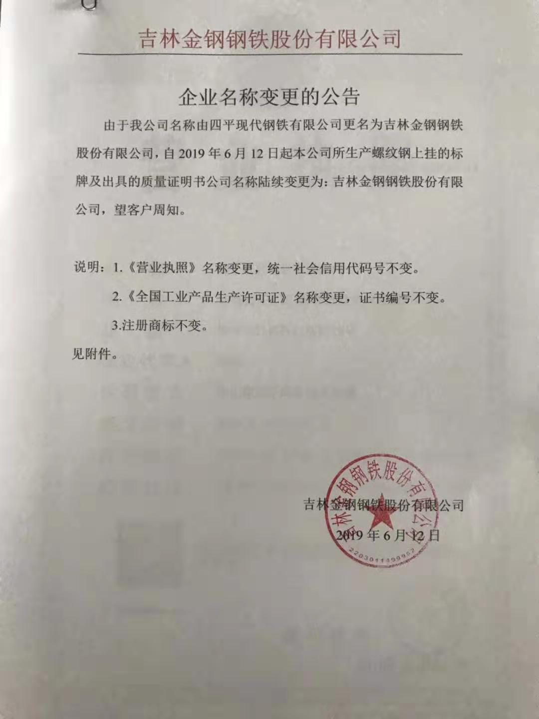 由于我公司名稱由四平現(xiàn)代鋼鐵有限公司更名為吉林金鋼鋼鐵股份有限公司,自2019年6月12日起本公司所生產(chǎn)螺紋鋼上掛的標(biāo)牌及出具的質(zhì)量證明書(shū)公司名稱陸續(xù)變更為:吉林金鋼鋼鐵股份有限公司,望客戶周知。