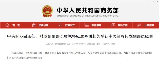 應(yīng)美方邀請(qǐng),中央財(cái)辦副主任、財(cái)政部副部長(zhǎng)廖岷擬于本周三率團(tuán)訪美,與美方就中美經(jīng)貿(mào)問(wèn)題進(jìn)行磋商,為10月份在華盛頓舉行的第十三輪中美經(jīng)貿(mào)高級(jí)別磋商做準(zhǔn)備。