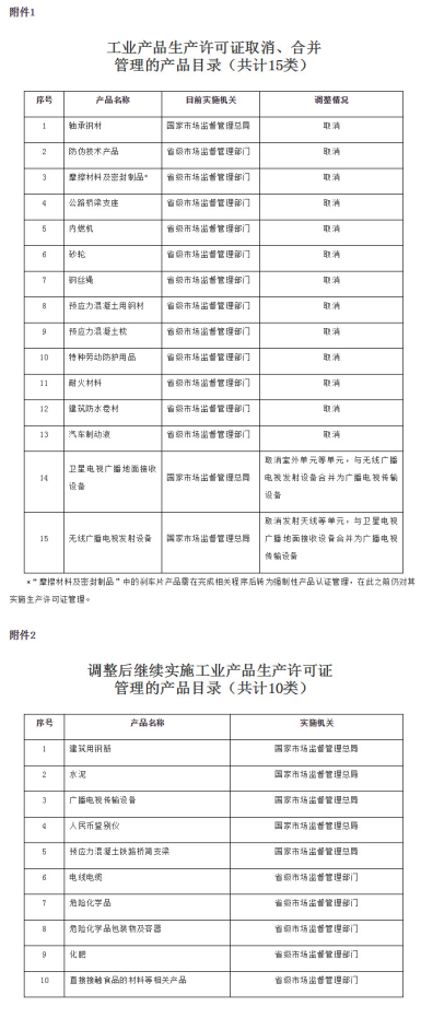 黨中央、國務院高度重視工業(yè)產品生產許可證制度改革?!稕Q定》明確,在近年來大幅壓減工業(yè)產品生產許可證基礎上,今年再取消內燃機、汽車制動液等13類工業(yè)產品生產許可證管理,將衛(wèi)星電視廣播地面接收設備與無線廣播電視發(fā)射設備2類產品壓減合并為1類,對涉及安全、健康、環(huán)保的產品,推動轉為強制性產品認證管理,認證費用由財政負擔。經調整,繼續(xù)實施許可證管理的產品由24類減少至10類。