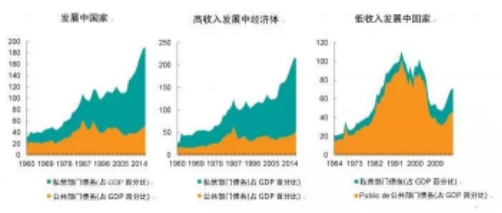 與常見的說法相反,大部分是私營部門債務(wù),從2008年占國內(nèi)生產(chǎn)總值的79%上升到2017年的139%;而公共部門債務(wù)在2017年僅占國內(nèi)生產(chǎn)總值的51%。自金融危機以來,高收入發(fā)展中國家的私營部門債務(wù)增長尤為迅猛,2017年達到國內(nèi)生產(chǎn)總值的165%,不過增長趨勢在低收入發(fā)展中國家也很明顯。