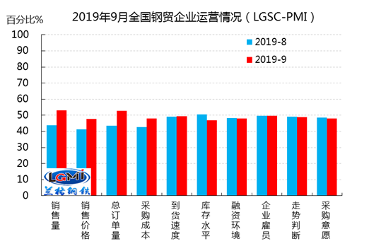 9月鋼鐵流通企業(yè)銷售量指數(shù)和訂單指數(shù)分別為53.1和52.8,分別較上月上升9.4和9.2個(gè)百分點(diǎn),重新回到擴(kuò)張區(qū)間,表明市場(chǎng)采購(gòu)需求重回旺季狀態(tài),并且需求明顯放量,其中主要表現(xiàn)在終端采購(gòu)的直供訂單明顯好轉(zhuǎn)。