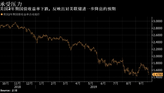 美國兩年期國債收益率周三從1.55%跌至1.48%,反映出對美聯(lián)儲降息的預(yù)期。10年期國債收益率連續(xù)第五天下跌,跌至1.6%以下。