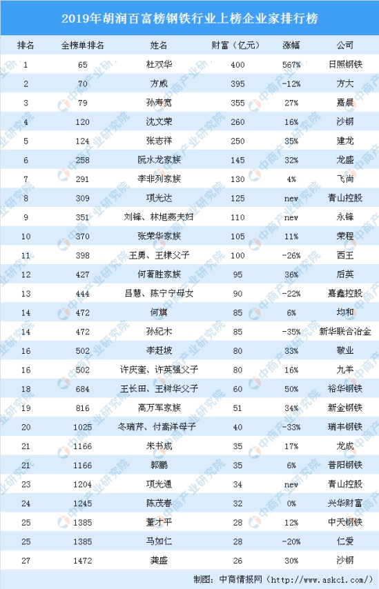 2019年胡潤(rùn)百富榜(鋼鐵篇):日照鋼鐵杜雙華財(cái)富最多