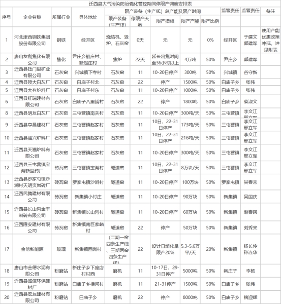 按照市“兩辦”關(guān)于印發(fā)《10月份全市大氣污染防治強(qiáng)化管控方案》的通知要求,10月份《遷西縣大氣污染強(qiáng)化管控期間停限產(chǎn)企業(yè)聯(lián)系表》《遷西縣大氣污染防治強(qiáng)化管控期間停限產(chǎn)調(diào)度安排表》公示如下: