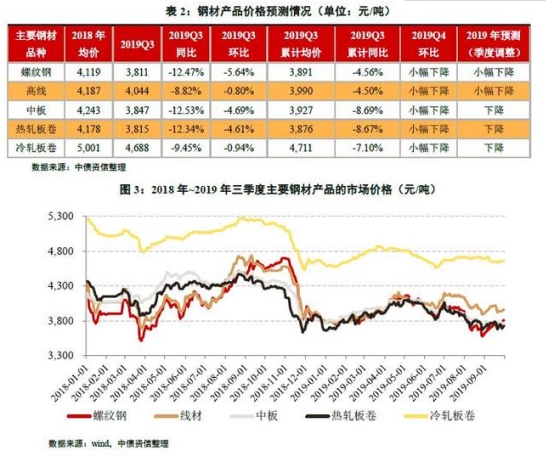 2019年三季度,受下游房地產(chǎn)、基建進(jìn)入暑期施工淡季的影響,下游需求有所下滑,鋼材產(chǎn)品價格環(huán)比均出現(xiàn)下滑,跌幅0.80%~5.64%,同比跌幅較大,跌幅范圍8.82%~12.53%。以2019年前三季度的累計平均價格計算,受房地產(chǎn)投資增長超預(yù)期的需求拉動,螺紋鋼和線材的同比降幅相對較低,同比下降4.56%和4.50%;汽車等需求大幅下滑導(dǎo)致板材的同比降幅較大,降幅在7.10%~8.69%范圍內(nèi)。