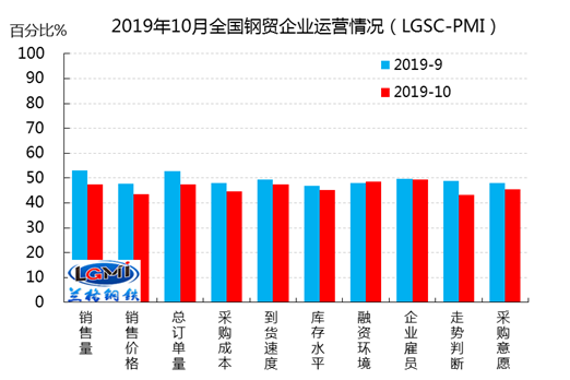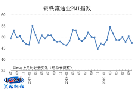 10月鋼鐵流通企業(yè)銷售量指數(shù)和訂單指數(shù)均為47.5,分別較上月下降5.6和5.3個(gè)百分點(diǎn),再次回到收縮區(qū)間,表明市場(chǎng)采購(gòu)需求不足,旺季不旺的局面明顯,其中主要表現(xiàn)在終端采購(gòu)的直供訂單明顯下降。