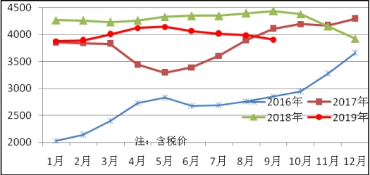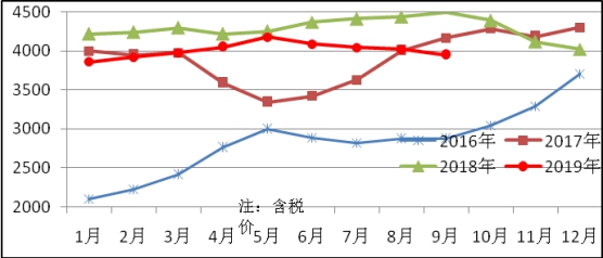 9月份生產(chǎn)中厚寬鋼帶647萬噸,同比增加51萬噸,上升8.6%;銷售655萬噸,其中出口30萬噸,產(chǎn)銷率101.3%;售價3906元/噸,比上月下跌85元/噸;月末庫存101萬噸,比上月減少8萬噸。中厚寬鋼帶平均價格見圖5。