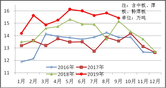 9月份生產(chǎn)特厚板72萬噸,同比增加12萬噸,上升19.4%,銷售69萬噸,其中出口7萬噸,產(chǎn)銷率95.7%;售價4674元/噸,比上月下跌137元/噸;月末庫存39萬噸,比上月增加3萬噸。