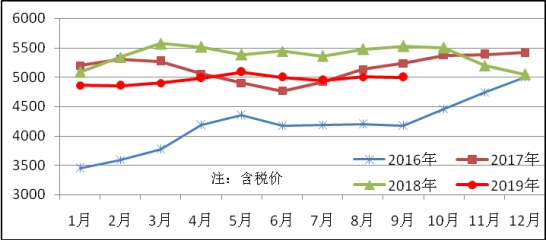 9月份生產(chǎn)鍍鋅板143萬噸,同比減少6萬噸,下降4.1%;本月銷售143萬噸,其中出口22萬噸,產(chǎn)銷率100.2%;售價4997元/噸,比上月下跌4元/噸;月末庫存34萬噸,與上月持平。鍍鋅板平均價格見圖8。