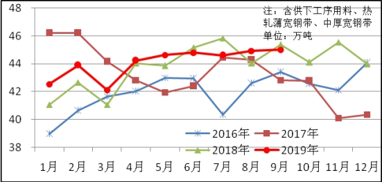 9月份中厚板軋機生產(chǎn)特厚板、中厚板463萬噸,同比減少1萬噸,下降0.2%。熱連軋機生產(chǎn)1350萬噸,同比增加20萬噸,上升1.5%;其中商品量803萬噸,同比增加2萬噸,增長0.2%。供下工序用料547萬噸,同比增加18萬噸,上升3.4%。冷連軋機生產(chǎn)483萬噸,同比增加34萬噸,上升7.5%;其中商品量346萬噸,同比增加32萬噸,上升10.1%。供下工序用料138萬噸,同比增加3萬噸,上升1.9%。中厚板軋機、熱連軋機、冷連軋機日產(chǎn)量變化見圖1-3。