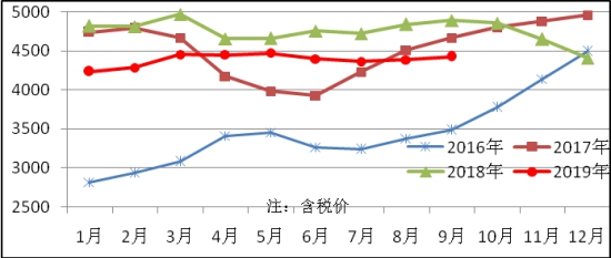 9月份生產(chǎn)中厚板391萬噸,同比減少13萬噸,下降3.2%,銷售402萬噸,其中出口26萬噸,產(chǎn)銷率102.9%;售價4335元/噸,比上月下跌72元/噸;月末庫存158萬噸,比上月減少11萬噸。中厚板平均價格見圖4。