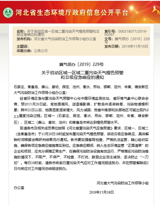河北省關(guān)于啟動(dòng)區(qū)域一區(qū)域二重污染天氣橙色預(yù)警和Ⅱ級(jí)應(yīng)急響應(yīng)的通知