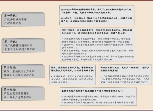 2017~18行業(yè)高利潤(rùn)刺激產(chǎn)能置換項(xiàng)目大幅增加。2016年以來,表內(nèi)外鋼鐵產(chǎn)能已去化近3億噸,鋼鐵產(chǎn)能方面政策重心已從產(chǎn)能去化逐步轉(zhuǎn)向嚴(yán)控新增產(chǎn)能投產(chǎn),當(dāng)前在建鋼鐵產(chǎn)能主要是產(chǎn)能置換項(xiàng)目。然而,2017~2018年行業(yè)高利潤(rùn)刺激下,鋼鐵行業(yè)資本開支和產(chǎn)能置換項(xiàng)目規(guī)模大增。2018年/2019年1~3季度鋼鐵行業(yè)資本開支分別同比新增14%和29%;據(jù)中鋼協(xié)數(shù)據(jù),截至2019年上半年,擬建產(chǎn)能置換項(xiàng)目涉及的新建粗鋼產(chǎn)能近2億噸  。