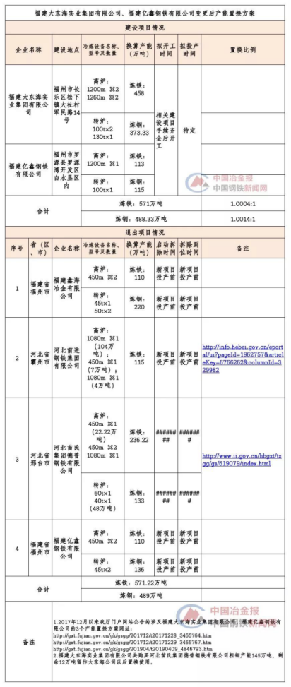 從最新的產(chǎn)能置換方案可以看出,福建大東海實業(yè)集團有限公司和福建億鑫鋼鐵有限公司將承接福建鑫海冶金有限公司、河北前進鋼鐵集團有限公司、河北苗氏集團德普鋼鐵有限公司、福建億鑫鋼鐵有限公司的產(chǎn)能,新建5座高爐、4座轉(zhuǎn)爐,合計煉鐵產(chǎn)能571萬噸、煉鋼產(chǎn)能488.33萬噸。