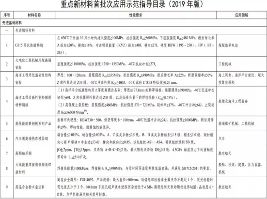 為進(jìn)一步做好重點(diǎn)新材料首批次應(yīng)用保險(xiǎn)補(bǔ)償試點(diǎn)工作,日前,工業(yè)和信息化部發(fā)布《重點(diǎn)新材料首批次應(yīng)用示范指導(dǎo)目錄(2019年版)》(以下簡(jiǎn)稱《目錄2019版》),G115馬氏體耐熱鋼、大噸位工程機(jī)械用超高強(qiáng)鋼板、海洋工程用低溫韌性結(jié)構(gòu)鋼板等40種先進(jìn)鋼鐵材料入選。