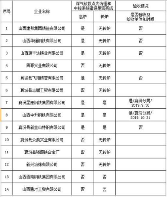 臨汾:鋼鐵行業(yè)煤氣放散治理工作完成情況