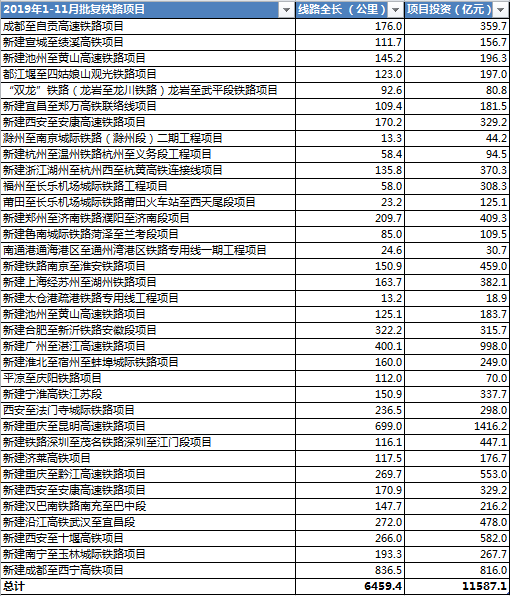 表1 2019年1-11月各地共批復(fù)鐵路投資項(xiàng)目