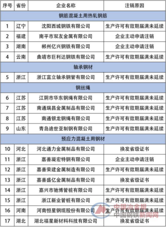日前,國(guó)家市場(chǎng)監(jiān)管總局發(fā)布公告稱,根據(jù)《中華人民共和國(guó)工業(yè)產(chǎn)品生產(chǎn)許可證管理?xiàng)l例》(國(guó)務(wù)院令第440號(hào))及《中華人民共和國(guó)工業(yè)產(chǎn)品生產(chǎn)許可證管理?xiàng)l例實(shí)施辦法》(質(zhì)檢總局令第156號(hào)),因生產(chǎn)許可證有效期屆滿未延續(xù)、企業(yè)主動(dòng)申請(qǐng)注銷證書等情形,市場(chǎng)監(jiān)管總局決定注銷沈陽西城鋼鐵有限公司等201家企業(yè)的工業(yè)產(chǎn)品生產(chǎn)許可證。具體情況如下表所示——