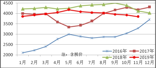 11月份生產(chǎn)中厚寬鋼帶628萬噸,同比增加72萬噸,上升12.9%;銷售629萬噸,其中出口23萬噸,產(chǎn)銷率100.2%;售價3855元/噸,比上月上漲1元/噸;月末庫存105萬噸,比上月減少1萬噸。中厚寬鋼帶平均價格見圖5。