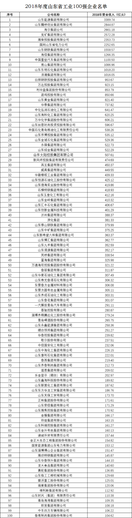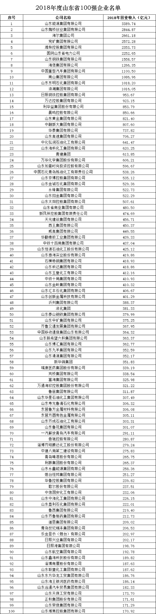 為更好發(fā)揮大企業(yè)示范帶動作用,進一步促進企業(yè)做強做優(yōu),依據(jù)企業(yè)2018年營業(yè)收入年報數(shù)據(jù)(企業(yè)集團為合并報表數(shù)據(jù)),經(jīng)企業(yè)自愿申報,省企業(yè)聯(lián)合會組織審核,確定了2018年度山東省100強企業(yè)和工業(yè)100強企業(yè)名單,經(jīng)省政府同意,現(xiàn)予以公布。