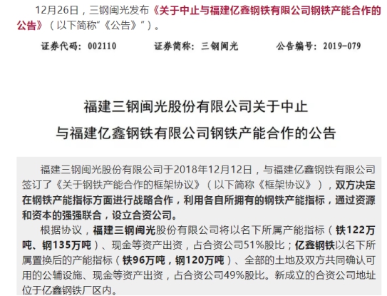 26日發(fā)布的《公告》稱,三鋼閩光經(jīng)與億鑫鋼鐵友好協(xié)商,中止上述戰(zhàn)略合作事項(xiàng)。