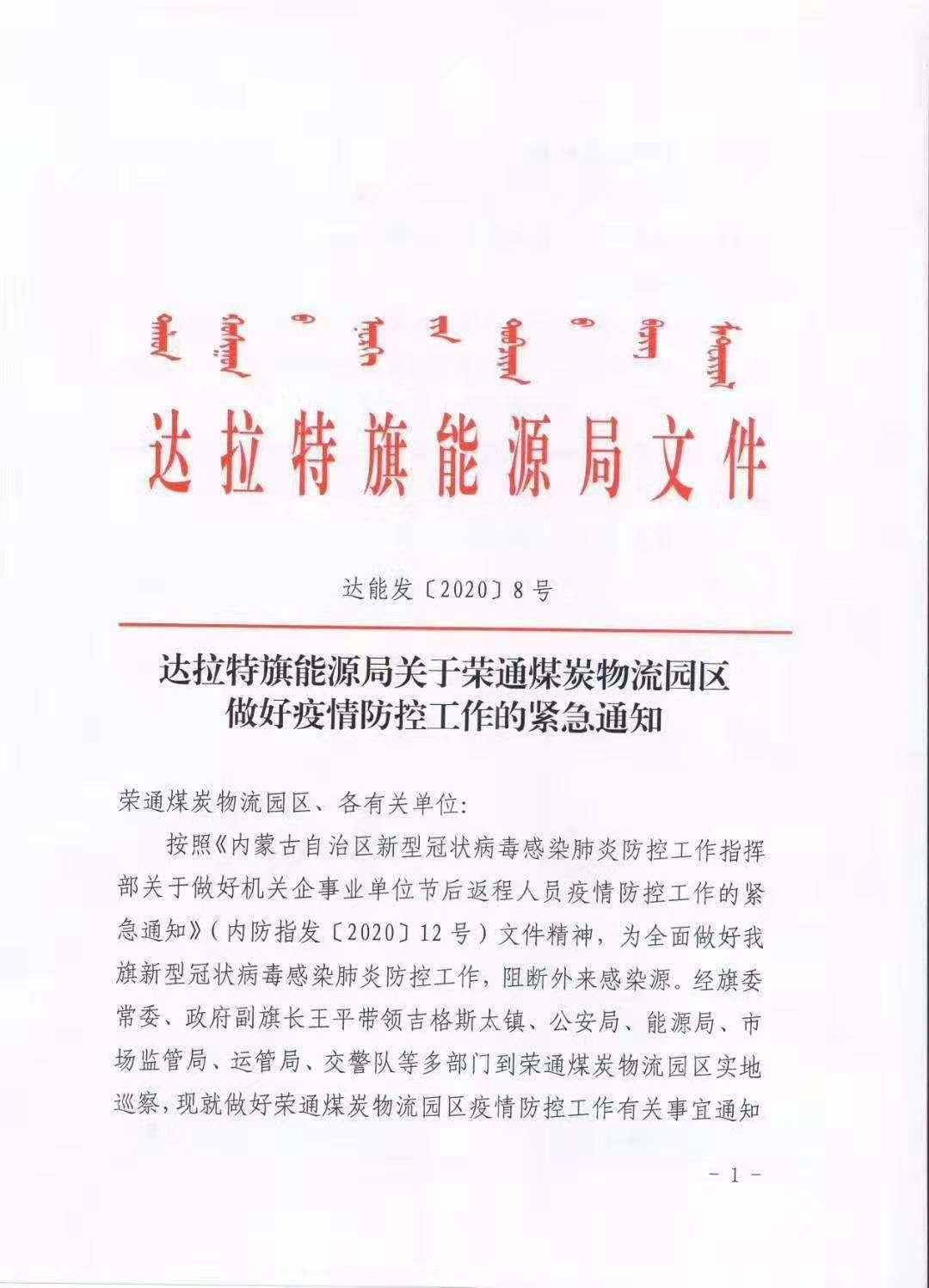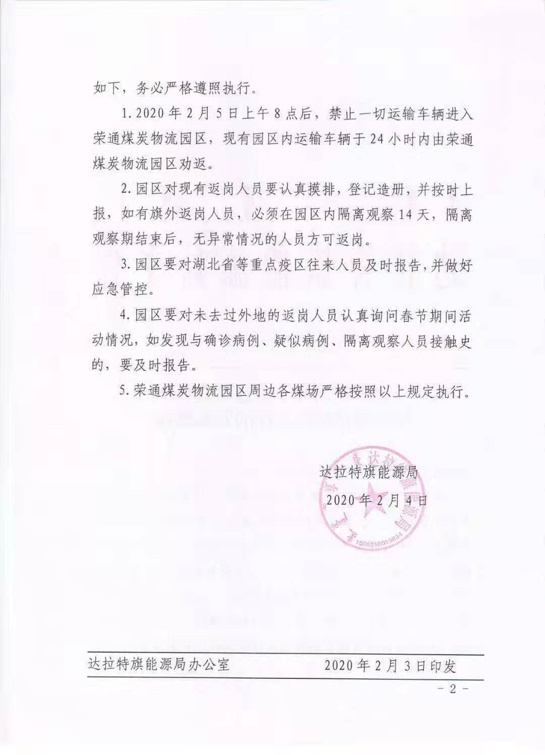 最新消息:昨日,達拉特旗能源局發(fā)布了《關于榮通煤炭物流園區(qū)做好疫情防控工作的緊急通知》,通知中稱,從2020年2月5日上午8點后,禁止一切運輸車輛進入榮通煤炭物流園區(qū),現(xiàn)有園區(qū)內(nèi)運輸車輛于24小時內(nèi)由榮通煤炭物流園區(qū)勸返。