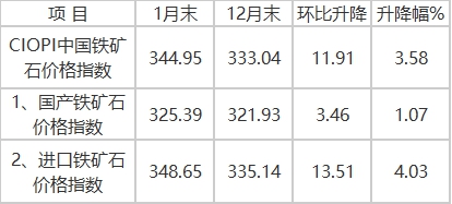 據(jù)鋼鐵協(xié)會監(jiān)測,1月末,中國鐵礦石價格指數(shù)(CIOPI)為344.95點(diǎn),環(huán)比上升11.91點(diǎn),升幅為3.58%,升幅較上年12月回落0.71個百分點(diǎn)。其中:國產(chǎn)鐵礦石價格指數(shù)為325.39點(diǎn),環(huán)比上升3.46點(diǎn),升幅為1.07%,升幅擴(kuò)大0.64個百分點(diǎn);進(jìn)口鐵礦石價格指數(shù)為348.65點(diǎn),環(huán)比上升13.51點(diǎn),升幅為4.03%,升幅收窄1.00個百分點(diǎn)。(見下圖、表)