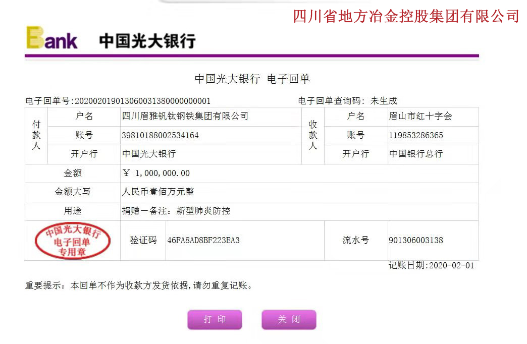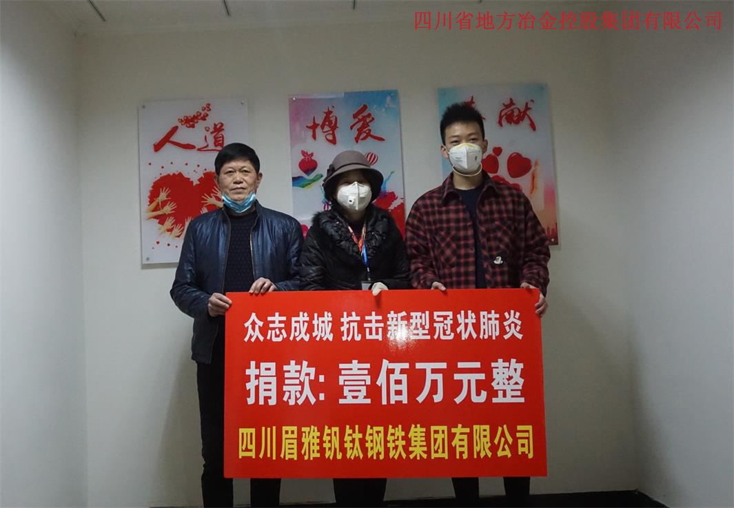 2月1日,冶控集團(tuán)眉山基地四川眉雅釩鈦鋼鐵集團(tuán)有限公司通過(guò)眉山市紅十字會(huì)和東坡區(qū)國(guó)庫(kù)集中支付中心共捐款150萬(wàn)元。該款項(xiàng)將用于定向支援新型冠狀病毒感染的肺炎疫情防控工作。