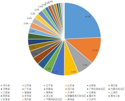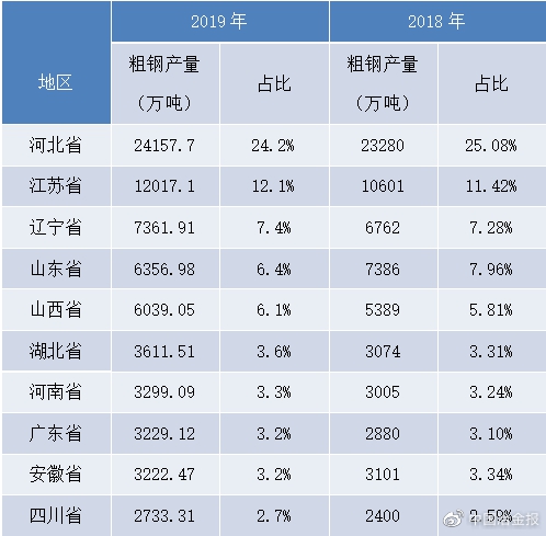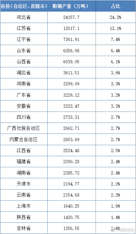 國家統(tǒng)計局數(shù)據(jù)顯示,2019年我國31個省市自治區(qū)中,河北粗鋼產(chǎn)量為24157.7萬噸,占全國總量的24.2%,位居榜首。有3個地區(qū)無鋼鐵,分別是海南、西藏自治區(qū)(無統(tǒng)計)、北京(粗鋼產(chǎn)量為0)。