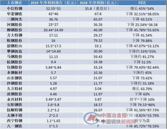 在目前已公布2019年業(yè)績(jī)(包括正式公布和預(yù)告)的23家鋼企上市公司中,除中信特鋼、久立特材、西寧特鋼外,大部分企業(yè)表示業(yè)績(jī)將出現(xiàn)下滑,最高下滑幅度超過(guò)90%。(詳見(jiàn)下表)