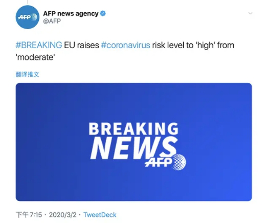 歐洲將新冠病毒風險級別提高到“高”。據(jù)法新社報道稱,歐盟委員會主席馮德萊恩周一(2日)表示,歐盟疾控機構已將新型冠狀病毒肺炎的風險級別從“中等”提升至“高(級別)”。