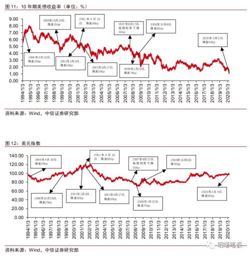 要點(diǎn)四:全球市場(chǎng)影響:美股下跌,美債破1!從以往美聯(lián)儲(chǔ)采取緊急降息之后大類資產(chǎn)的走勢(shì)來(lái)看,雖然美聯(lián)儲(chǔ)采取降息政策目的在于刺激經(jīng)濟(jì),但緊急降息本身也通常意味著嚴(yán)重事態(tài),市場(chǎng)情緒也更偏向于避險(xiǎn),因此緊急降息之后短期對(duì)于美股與美元的更偏利空,美債隨之走強(qiáng)。相較于新冠疫情在海外的快速發(fā)酵,國(guó)內(nèi)新冠疫情總體趨于穩(wěn)定,美聯(lián)儲(chǔ)降息帶來(lái)的全球流動(dòng)性改善更有利于國(guó)內(nèi)資產(chǎn)。從風(fēng)險(xiǎn)因素的角度衡量,疫情仍舊是當(dāng)前影響市場(chǎng)走勢(shì)的主要風(fēng)險(xiǎn)點(diǎn),新冠疫情帶來(lái)的不確定性加深或?qū)τ谌蚪?jīng)濟(jì)復(fù)蘇產(chǎn)生一定影響,因此從國(guó)內(nèi)大類資產(chǎn)走勢(shì)來(lái)看,對(duì)于國(guó)內(nèi)股市影響仍舊有待觀察,對(duì)于國(guó)內(nèi)債市明顯利多。