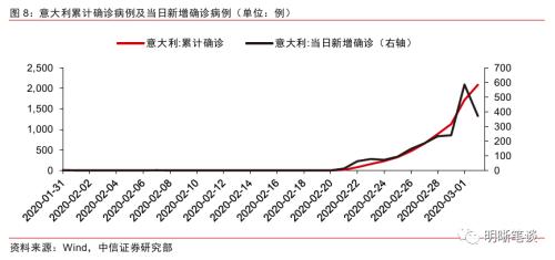 全球范圍內(nèi)新冠肺炎疫情升級(jí),疫情蔓延至多國(guó),截至3月2日,中國(guó)以外已有64個(gè)國(guó)家出現(xiàn)確診病例。其中韓國(guó)、意大利、伊朗最為嚴(yán)重,累計(jì)確診病例均超過(guò)2000例。意大利自2月22日新冠肺炎確診人數(shù)激增,截至3月3日,意大利累計(jì)確診病例增加至2502例,累計(jì)死亡病例增加至79例,疫情迅速傳播升級(jí)。韓國(guó)自2月20日新冠肺炎確診人數(shù)迅速增加,截至3月3日下午,韓國(guó)累計(jì)確診病例已經(jīng)達(dá)到5186例,較上一日新增974例。