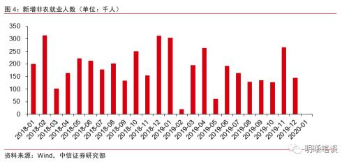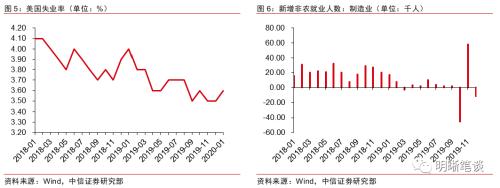 就業(yè)方面,美國(guó)1月非農(nóng)就業(yè)數(shù)據(jù)略好于預(yù)期,但失業(yè)率略有上升,非農(nóng)就業(yè)增長(zhǎng)主要由暖冬氣候促進(jìn)的建筑業(yè)和服務(wù)業(yè)貢獻(xiàn),制造業(yè)仍然保持低迷態(tài)勢(shì)。美國(guó)1月季調(diào)后新增非農(nóng)就業(yè)人口22.5萬(wàn)人,預(yù)期16萬(wàn)人,前值14.5萬(wàn)人;失業(yè)率為3.6%,預(yù)期3.5%,前值3.5%;就業(yè)參與率為63.4%,預(yù)期63.2%,前值63.2%。平均時(shí)薪同比增長(zhǎng)3.1%,預(yù)期增長(zhǎng)3%,前值增長(zhǎng)2.9%;環(huán)比增長(zhǎng)0.2%,預(yù)期增長(zhǎng)0.3%,前值增長(zhǎng)0.1%。1月非農(nóng)數(shù)據(jù)的增長(zhǎng)主要由建筑業(yè)和服務(wù)業(yè)所貢獻(xiàn),受暖冬氣候影響,與天氣好壞密切相關(guān)的建筑業(yè)、服務(wù)業(yè)表現(xiàn)強(qiáng)勁;但制造業(yè)表現(xiàn)低迷,新增就業(yè)人數(shù)延續(xù)12月下行趨勢(shì),就業(yè)人數(shù)減少1.2萬(wàn)人。