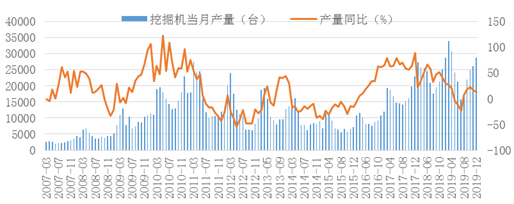 據(jù)國(guó)家統(tǒng)計(jì)局?jǐn)?shù)據(jù),2019年,挖掘機(jī)產(chǎn)量26.6萬(wàn)臺(tái),同比增長(zhǎng)14.7%。其中,12月產(chǎn)量2.9萬(wàn)臺(tái),同比增長(zhǎng)13.0%,增速呈現(xiàn)下滑趨勢(shì)。工程機(jī)械行業(yè)具有明顯的周期性和季節(jié)性,年際間、月度間產(chǎn)銷(xiāo)量波動(dòng)幅度較大。挖掘機(jī)的產(chǎn)銷(xiāo)量亦呈現(xiàn)周期性特征,本輪景氣周期始自2016年,挖掘機(jī)月度產(chǎn)量增速逐步提高,2018年后增速開(kāi)始回落,2019年淡季月份出現(xiàn)負(fù)增長(zhǎng),但全年仍為正增長(zhǎng)。