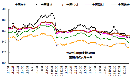 2月份,春節(jié)因素疊加新冠疫情影響,鋼鐵下游需求異常疲軟,廠庫、社庫均創(chuàng)歷史新高,供需矛盾突出,國內(nèi)鋼鐵市場震蕩下行。據(jù)蘭格鋼鐵云商平臺監(jiān)測數(shù)據(jù)顯示,截至2月28日,蘭格鋼鐵全國鋼材綜合價格指數(shù)為138.7,較上月末下降5.0%,年同比下降7.4%。其中,建材價格指數(shù)為147.1,較上月末下降5.1%,年同比下降8.7%;板材價格指數(shù)為128.5,較上月末下降6.3%,年同比下降6.5%;型材價格指數(shù)為146.8,較上月末下降1.7%,年同比下降7.1%;管材價格指數(shù)為151.3,較上月末下降0.9%,年同比下降5.6%(詳見圖1)。