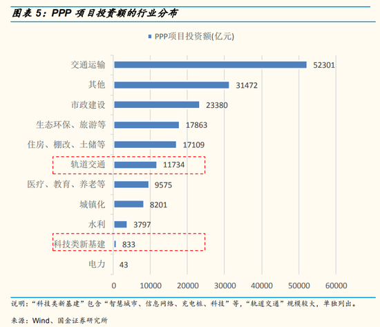 我們從 PPP 項目的行業(yè)分布來看,總體來看“新基建”相關(guān)項目占比為  7%。具體而言,“交通運(yùn)輸、市政建設(shè)”等行業(yè)投資規(guī)模相對較大,分別為 5.2 萬億、2.3 萬億。而“新基建”相關(guān)的軌道交通和科技行業(yè)合計規(guī)模 1.3  萬億,總體占比達(dá) 7%。其中軌道交通為 1.2 萬億,科技類新基建為 833 億。