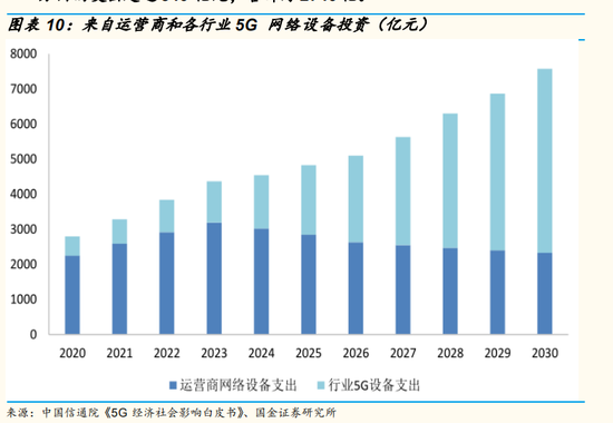 2020 年是 5G 商用初期,預(yù)計運(yùn)營商開展 5G 網(wǎng)絡(luò)大規(guī)模建設(shè)。預(yù)計電信運(yùn)營商在  5G 網(wǎng)絡(luò)設(shè)備上的投資超過 2200 億元,各行業(yè)在 5G 設(shè)備方面的支出超過 540 億元,合計為 2740 億。