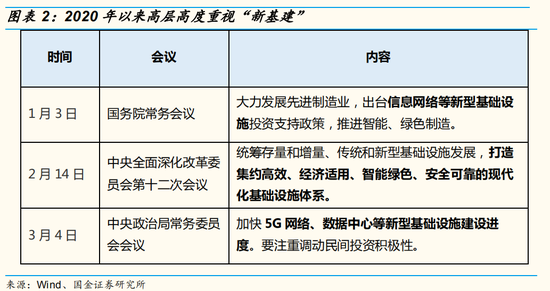 2020 年以來,高層頻繁發(fā)聲,多次強(qiáng)調(diào)“新基建”的建設(shè)。3 月 4 日,政治局常務(wù)會議再次強(qiáng)調(diào)“要加快  5G 網(wǎng)絡(luò)、數(shù)據(jù)中心等新型基礎(chǔ)設(shè)施建設(shè)進(jìn)度。要注重調(diào)動民間投資積極性”。