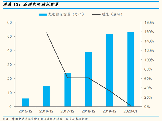 根據(jù)《2019-2020 年度中國充電基礎(chǔ)設(shè)施發(fā)展年度報告》,2020  年預(yù)計我國將新增公共充電樁  15 萬臺、新增私人樁 30 萬臺。按照公共充電樁平均投資額 5 萬左右,私人樁投資額 0.2 萬左右,新增公共充電場站約 8 千座。因此我們預(yù)計 2020  年充電樁投資規(guī)模在 100 億左右。