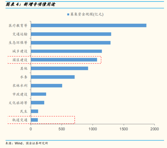 從專項債披露的資金用途來看,“軌道交通”和“園區(qū)建設(shè)”中的科技產(chǎn)業(yè)園項目屬于“新基建”的范疇,總體來看上述兩大項目規(guī)模為  1180 億,占總規(guī)模的 12%。