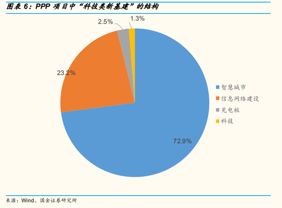 結(jié)構(gòu)上來看,科技類新基建中智慧城市、信息網(wǎng)絡(luò)、充電樁和其他科技類占比分比為  72.9%、23.2%、2.5%、1.3%。