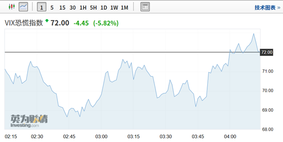 衡量美股波動(dòng)率的恐慌指數(shù)(VIX)當(dāng)?shù)貢r(shí)間19日盤中一度下挫,收于72.00點(diǎn),跌幅為5.82%。