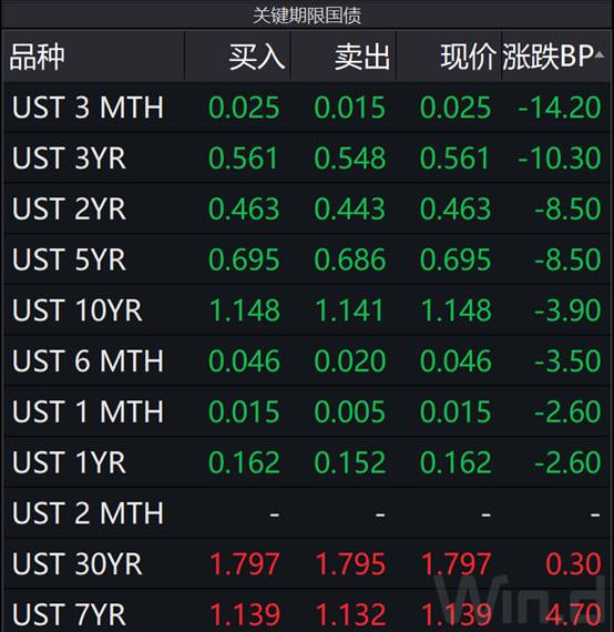 當(dāng)?shù)貢r(shí)間周四美債收益率多數(shù)下跌,3月期美債收益率跌14.2個(gè)基點(diǎn)報(bào)0.025%,2年期美債收益率跌8.5個(gè)基點(diǎn)報(bào)0.463%,3年期美債收益率跌10.3個(gè)基點(diǎn)報(bào)0.561%,5年期美債收益率跌8.5個(gè)基點(diǎn)報(bào)0.695%,10年期美債收益率跌3.9個(gè)基點(diǎn)報(bào)1.148%,30年期美債收益率漲0.3個(gè)基點(diǎn)報(bào)1.797%。