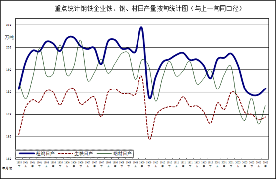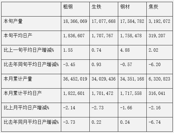 根據(jù)重點(diǎn)統(tǒng)計(jì)鋼鐵企業(yè)產(chǎn)量估算,本旬全國共生產(chǎn)粗鋼2494.82萬噸,日產(chǎn)粗鋼249.48萬噸、環(huán)比增長1.0%、同比增長2.48%;生產(chǎn)生鐵2112.47萬噸,日產(chǎn)生鐵212.20萬噸、環(huán)比增長0.45%、同比增長7.22%;生產(chǎn)鋼材3023.0萬噸,日產(chǎn)鋼材302.30萬噸、環(huán)比增長0.22%、同比增長0.48%。本月累計(jì)平均日產(chǎn),全國粗鋼環(huán)比下降3.33%、同比增長2.70%,生鐵環(huán)比下降3.55%、同比增長7.21%,鋼材環(huán)比增長6.26%、同比增長0.04%。