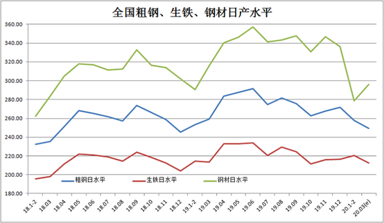 2020年3月中旬,重點(diǎn)統(tǒng)計(jì)鋼鐵企業(yè)共生產(chǎn)粗鋼1836.61萬噸、生鐵1707.77萬噸、鋼材1758.48萬噸、焦炭319.21萬噸。本旬平均日產(chǎn),粗鋼183.66萬噸、環(huán)比增長1.55%、同比下降4.02%;生鐵170.78萬噸、環(huán)比增長0.74%、同比下降-0.49%;鋼材175.85萬噸、環(huán)比增長4.88%、同比增長1.11%。