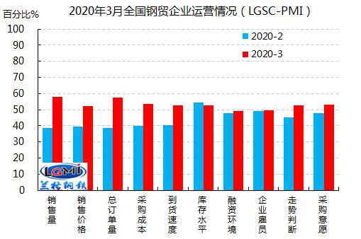 蘭格鋼鐵云商平臺統(tǒng)計發(fā)布的2020年3月份鋼鐵流通業(yè)PMI總指數(shù)為53.4,比上月回升6.3個百分點。從分類指數(shù)看,構(gòu)成鋼鐵流通業(yè)PMI的10個分類指數(shù)9升1降,其中銷售量、銷售價格、總訂單量、采購成本、到貨速度、融資環(huán)境、企業(yè)雇員、走勢判斷和采購意愿9項指數(shù)均出現(xiàn)不同程度上升,其中銷售量、總訂單量和采購成本3項指數(shù)回升尤為明顯,而庫存水平1項指數(shù)則小幅下降。