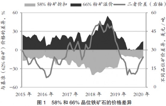 澳大利亞大部分品位62%鐵礦石的FOB價格在2019年7月份達(dá)到110美元/噸的峰值,但隨后價格在2019年11月份降至75美元/噸左右。2020年1、2月份,鐵礦石價格回升至85美元/噸以上。而隨著中國鐵礦石需求增加以及巴西高品位鐵礦石供應(yīng)減少,自2018年末高品位鐵礦石的價格大幅上漲。隨后,市場調(diào)整以使用更多的低品位鐵礦石,近期高品位與低品位鐵礦石之間的價格溢價有所收窄,58%和66%品位鐵礦石的價格差異如圖1所示。