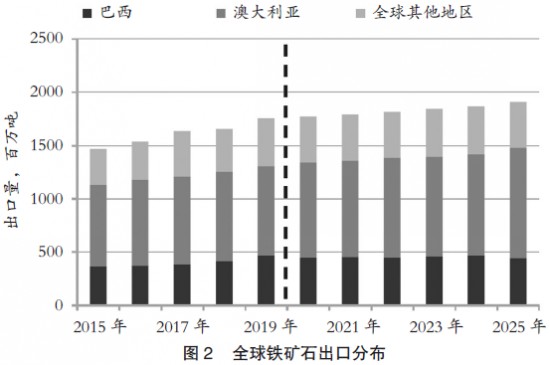 澳大利亞鐵礦石出口量與產(chǎn)量變化趨勢基本一致,預(yù)計2024/25財年澳大利亞鐵礦石出口量將從2019/20財年的8.77億噸(估計值)增加到近10億噸。鐵礦石出口量的增長將有助于抵消鐵礦石價格下跌的影響,如果未來幾年鐵礦石價格再次上漲,出口收入可能會創(chuàng)新紀(jì)錄。全球鐵礦石出口分布如圖2所示。